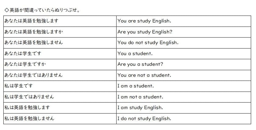 様々な文法に対し、正しい英文と、一般動詞(do)とbe動詞を入れ替えた誤った英文がランダムに表示されるプリントです。